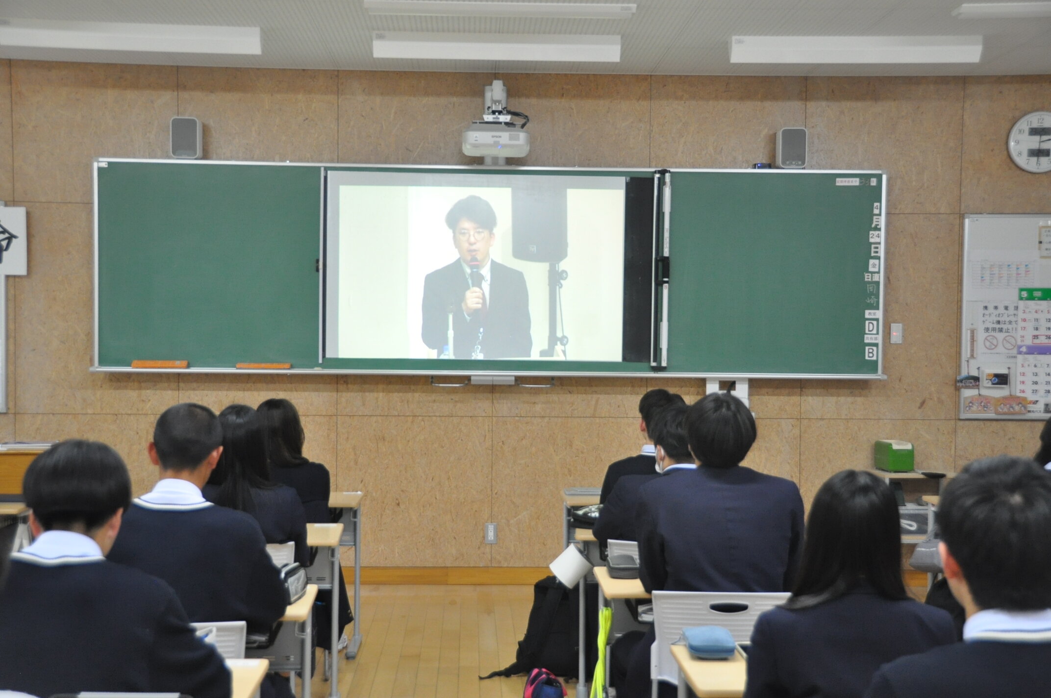 この講演は、1年生はSAKURAホールで聴講し2,3年生は各教室にてLive配信を視聴するという方法で行いました。